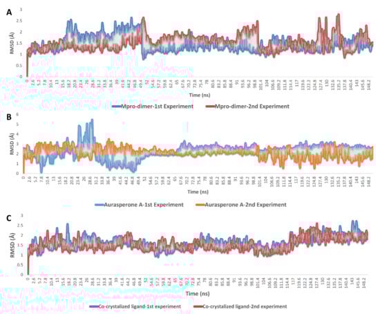 Consequently, we selected Mpro for a further molecular dynamics-based investigation to find out how it can interact with aurasperone A (3). We subjected the aurasperone A-Mpro complex to 150 ns MDS in two independent experiments. Additionally, we built the simulation system using Mpro in its functioning dimeric form, trying to make the MDS experiments as realistic as we could.