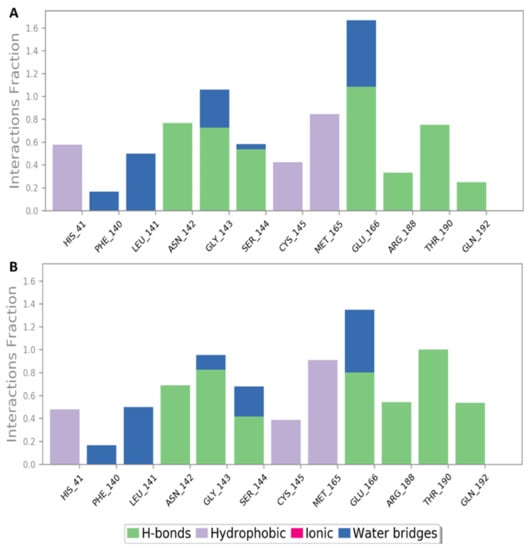 Mpro-aurasperone A contacts over two independent 150 ns MDS experiments, (A) and (B) respectively.