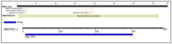 Conserved domains and motifs for the SQS genes of Aurantiochytrium limacinum: Showing the conserved motifs, superfamily, substrate binding, and aspartate rich regions for the selected sequence.