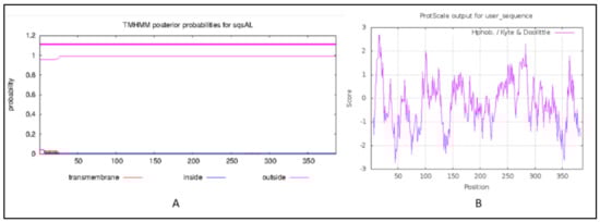 The Transmembrane (TM) helices prediction performed using TMHMM 2.0 (https://services.healthtech.dtu.dk/service.php?TMHMM-2.0, accessed on 6 December 2021) revealed that the squalene synthase from A. limacinum did not contain any TM helices (Figure 3A), while two TM helices were reported in most of the squalene synthase that was analyzed for other species, such as plants. The absence of TM region, particularly in the SQS of Aurantiochytrium species, indicates the location and solubility of the enzyme in the thraustochytrids may differ from most of the SQS reported from other groups [29]. In-vitro studies about the effects of an absence of TM region on the expression and enzyme activities need to be further investigated. The hydropathy analysis performed using protscale was in the range between −2.733 and +2.678 and window size 9, as shown in Figure 3B.