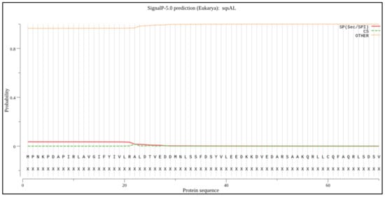 The signal peptide prediction was performed using SignalP 5.0 (https://services.healthtech.dtu.dk/service.php?SignalP-5.0, accessed on 28 November 2021). The output from the analysis, as shown in Figure 4, shows different scores for amino acid sequences. As shown in Figure 4, no signal peptide was predicted with an above-threshold value in the selected sequences, which were similar to previous studies [27]. The peroxisome targeting signal 1 (PTS1; SKL AA position 369 to 371) and 2 (PTS2; AA position 327, 330, 344, and 348) were observed at the C-terminal domain as previously identified for SQS from Aurantiochytrium sp. KRS101 as a possible anchor to the membrane [15].