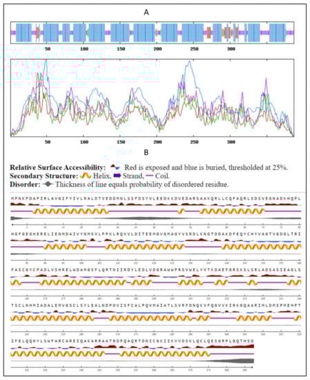 Secondary structure prediction was performed using the SOPMA-NPSA method (https://npsa-prabi.ibcp.fr/cgi-bin/secpred_sopma.pl, accessed on 29 November 2021). It revealed that the SQS from the A. limacinum species is mainly composed of α-helix (66.14%) followed by random coils (25.84%), extended strands (4.39%), and β-Sheets (3.36%) (Figure 5A). Our findings were matching in the same range with a slight variation with the secondary structure predicted previously for the SQS of different species, such as Withania somnifera species, Gienseng species and species belonging to Fabaceae family [16,26,30,31]. These data were supported along with information about the Psi-phi dihedral angles and surface accessibility using NetsurfP 2.0 (https://services.healthtech.dtu.dk/service.php?NetSurfP-2.0/, accessed on 8 December 2021). The prediction regarding the relative surface accessibility and disorder residues was as shown in Figure 5B.