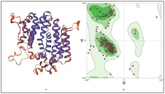 The 3-D structure modeling was performed using appropriate templates. Nine different templates (3vj9.1.A, 3wce.1.B, 3v66.1.A, 3vja.1.A, 3wca.1.A, 3vj8.1.A, 3vja.1.A, 3vja.1.A, and 3weg.1.A) with lower e-value, higher identity, and availability of X-ray crystal structure were selected for the model prediction on SWISS-MODEL platform (http://swissmodel.expasy.org/, accessed on 16 December 2021). One model out of nine was finalized based on the Q-Mean score (−4.18) predicted based on the template structure (3vj9.1.A; crystal structure of human squalene synthase). The 3-D structure predicted was observed as shown in Figure 6A. The 3-D model generated SQS of selected species was predicted to majorly contain α- helixes and was made of a monomer with large space in the center as a binding site. The active site at the center provides space to interact with NAD(P)H and Mg2+ via hydrogen bonding [32]. The 3-D structure was similar to many predicted models reported earlier for the SQS from different species [16,17,26,30]. The Ramachandran plot, as shown in Figure 6B, showed that 93.37% of the model structure was in favored regions, and the protein was stereo-chemically stable. The dark green in the graph indicates the allowed regions. The stereochemical specificity and dihedral angles [ψ, ϕ] were indicated in Figure 6B. The modeled structure was further assessed by the ProSa-web server by analyzing the protein folding energy. The Z score for the SQS structure modeled was found to be −7.93. Z-score is the estimation based on the energy calculation for each of the amino acids and the comparison with the known template structure. The two different colors, as shown in Figure 7A, indicate the groups of structures explained by X-ray or NMR (Nuclear Magnetic Resonance). The value of the Z-score of modeled structure for SQS (A. limacinum species) was in the acceptable range (+10 to −10, a preferably negative value is good) [33]. Figure 7B shows the energy calculation for each amino acid, with all values predicted to be negative. Amino acid residues resulting in positive values were absent in the predicted SQS model [26]. H-bond energy using the VADAR analysis showed the value of −1.5 against the expected value of −2.0.