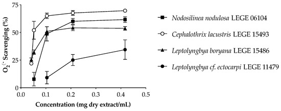 The aqueous extracts were significantly more effective in O2•− scavenging than the acetone extracts (Table 6) and presented a dose-dependent activity (Figure 1), with the freshwater strains standing out from the marine strains. Cephalothrix lacustris LEGE 15493 was the most effective strain, presenting the lowest IC50 value (65.5 µg dry extract/mL, p < 0.05), followed by Leptolyngbya boryana LEGE 15486 and Nodosilinea nodulosa LEGE 06104. Leptolyngbya cf. ectocarpi LEGE 11479 was the only strain which did not reach the IC50 for the aqueous extract (Table 6). On the other hand, the acetone extract of this strain was the most effective in O2•− scavenging.