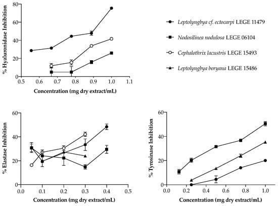 In the search for natural alternatives to commercial anti-aging ingredients, focusing the enzymes mentioned above, the activity of cyanobacteria extracts was explored (Figure 2). Regarding HAase, only three strains were able to inhibit this enzyme, acting in a dose-dependent manner: the aqueous extract of Leptolyngbya cf. ectocarpi LEGE 11479 (IC50 = 863 µg/mL), and the acetone extracts of Cephalothrix lacustris LEGE 15493 and Nodosilinea nodulosa LEGE 06104, the latter two only reaching IC25 (832 and 995 µg/mL, respectively). Even though these values seem high, their range of activity was similar to that of the reference drug di-sodium cromoglicate (DSCG) (IC50 = 1105 µg/mL). Moreover, it is worth mentioning that, for the highest concentration tested (1 mg/mL), Leptolyngbya cf. ectocarpi LEGE 11479 inhibited this enzyme in 80% (Figure 2), which makes this extract promising as a cosmetic ingredient.