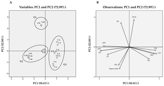 Projection of cyanobacteria extracts (A) [variables: Nodosilinea nodulosa LEGE 06104 (LEGE 06104W and LEGE 06104A), Leptolyngbya cf. ectocarpi LEGE 11479 (LEGE 11479W and LEGE 11479A), Cephalothrix lacustris LEGE 15493 (LEGE 15493W and LEGE 15493A), and Leptolyngbya boryana LEGE 15486 (LEGE 15486W and LEGE 15486A), where “W” refer to aqueous extracts and “A” to acetone extracts] and loadings (B) by chemical composition and bioactivities [variables: total phenolic content (TPC), total proteins (PT), carotenoids (Car), chlorophyll a (Chl), radical scavenging activity (Superoxide), hyaluronidase (Hyal), elastase (Ela), tyrosinase (Tyr), phycocyanin (PC), phycoerythrin (PE), allophycocyanin (APC), SPF at 1000 µg/mL (SPF)] into the plane composed by the principal components PC1 and PC2 containing 72.99% of the total variance.