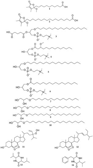 The known compounds were identified by comparing their spectroscopic and/or spectrometric data with those reported in the literature (for structures and NMR data, see Supplementary Material). Compounds 5 and 6 were, respectively, identified as the known lysophospholipids 1-O-octadecyl-sn-glycero-3-phosphocholine [19] and 1-palmitoyl-sn-glycero-3-phosphocholine [20]. Compounds 7 to 10 correspond to known monoalkyl glycerol ethers previously isolated from marine sponges: 1-O-hexadecylglycerol (chimyl alcohol 7) [21], 1-O-octadecylglycerol (batyl alcohol 8) [21], 3-nonadecyloxy-1,2-propanediol (glycerol 1-nonadecyl ether 9) [22] and 3-icosoxypropane-1,2-diol (glycerol 1-eicosyl ether 10) [22]. Compounds 11 and 12 were determined, respectively, as a mixture of 5α,8α-epidioxy-24(R/S)-hydroperoxystigmasta-6,28-dien-3β-ol [23] and a mixture of 5α,8α-epidioxy-24(R/S)-stigmasta-6,22E-dien-3β-ol [24]. These two epidioxysterols were previously isolated from marine sponges Lendenfeldia chondrodes [23] and Thalysias juniperina [24]. The last two known compounds identified were diketopiperazines cyclo(Val-Leu) (13) and cyclo(Val-Phe) (14) [25]. These two compounds have previously been isolated from marine microorganisms Streptomyces fungicidicus and Paecilomyces marquandii [26,27].