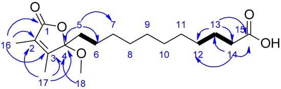 Compound 1 was isolated as a yellow oil. High-resolution mass spectrometry (HRMS) analysis revealed a sodium adduct ion at m/z 349.1985 [M + Na]+ consistent with molecular formula C18H30O5 and incorporating four unsaturations. It provided a negative specific rotation (c 0.024, CH3OH). Analysis of the 1H NMR and HSQC data (Table 1) indicated that 1 contained two olefinic methyl singlets H-16 (δH 1.84) and H-17 (δH 1.90), one oxygenated methyl protons H-18 (δH 3.07), two methylene protons near heteroatom H-5 (δH 1.73, 1.95) and H-14 (δH 2.15) and eight methylene protons (δH 1.13−1.59). A comprehensive analysis of the 13C NMR revealed two olefinic carbons C-2 (δC 128.4) and C-3 (δC 158.4), one ketone C-1 (δC 173.8), one carboxylic acid carbonyl C-15 (δC 183.0), one methoxy carbon C-18 (δC 50.5) and one acetal C-4 (δC 111.9). HMBC correlations from H-16 to C-1, C-2, C-3 and from H-17 to C-2, C-3 and C-4 were observed (Figure 2). These correlations along with the additional HMBC correlation between H-18 and C-4 disclosed a substitued α,β-unsaturated 2,3-dimethyl-γ-lactone moiety, similar to that of the known butenolide 13-(2-hydroxy-3,4-dimethyl-5-oxo-2,5-dihydrofuran-2-yl) tridecanoic acid methyl ester and sinularones [28,29]. In the COSY spectrum, H-5, H-12, and H-13 showed correlations, respectively, to H-6, H-13, and H-14. In combination with the HMBC correlations between H-5 and C-4, C-6, C-7 in one hand, as well as H-14 and C-12, C-13, C-15 in the other hand, a carboxylic acid side chain from C-5 to C-15 was confirmed. In regard to the absolute configuration of carbon C-4, some of the known butenolides with α,β-unsaturated 2,3-dimethyl-γ-lactone moiety were reported to have R configuration at their stereogenic center and to show negative optical rotation, such as caulerpalide B [30]. Therefore, as compound 1 exhibited a negative optical rotation , we tentatively assumed C-4 to be 4R configuration. Consequently, compound 1 was identified as sinularone J, a new butenolide, analogue to sinularones [29].