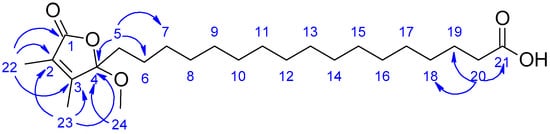 Compound 2 was isolated as a colorless oil. High-resolution mass spectrometry (HRMS) analysis revealed a sodium adduct ion at m/z 433.2921 [M + Na]+ consistent with molecular formula C24H42O5 and incorporating four unsaturations. It provided a negative specific rotation (c 0.021, CH3OH). The NMR data of compound 2 (Table 2) were similar to those of 1 with the exception of the carboxylic acid side chain length. This information was supported by the molecular weight of 2 (m/z 433.2921) [M + Na]+, which is 84 amu more than that of 1 (m/z 349.1985) [M + Na]+ consistent with a difference of six methylenes. HMBC interactions from H-5 to C-4, C-6, C-7 and from H-20 to C-18, C-19, C-21 helped to establish the attachment of the carboxylic acid side chain made of 16 methylenes to the α,β-unsaturated 2,3-dimethyl-γ-lactone moiety (Figure 3). In regard to the absolute configuration of carbon C-4, we supposed C-4 to be 4R configuration as well. Therefore, compound 2 was identified as sinularone K, a structural analog of 1.