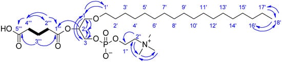 Compound 3 was isolated as an amorphous powder. Its molecular formula was established as C31H63NO9P+ based on a protonated molecule ion at m/z 624.4235 [M + H]+ consistent with molecular formula C31H62NO9P, incorporating three unsaturations. HRMS/MS readily allowed the recognition of a phosphatidylcholine skeleton. MS/MS fragmentations decompose compound 3 to produce ions at m/z 510.4 [M + H]+ consistent with molecular formula C26H56NO6P (1-O-octadecyl-sn-glycero-3-phosphocholine), m/z 184.1 [M + H]+ consistent with molecular formula C5H14NO4P (protonated phosphocholine ion), m/z 125.0 [M + H]+ consistent with molecular formula C2H5O4P (protonated phosphate), m/z 86.1 [M + H]+ consistent with molecular formula C5H11N (phosphocholine head) that are diagnostic fragments for glycerophosphatidylcholine species [31]. Analysis of 1H NMR, HSQC and HMBC (Table 3) showed oxygenated methylene and methine proton signals C-1 (δH 3.59, 3.61; δC 70.2), C-2 (δH 5.17; δC 73.2), C-3 (δH 3.97, 4.03; δC 65.5) belonging to a glycerol unit, methylene proton signals attached to heteroatoms C-1’’ (δH 4.27; δC 60.5), C-2’’ (δH 3.65; δC 67.4) as well as a singlet signal integrated to nine methyl protons corresponding to three N-methyl groups (δH 3.23; δC 54.7) indicated the presence of choline. The presence of a linear alkyl chain was also shown by methylene proton signals (δH 1.25-1.54; δC 23.8-30.8). One methylene is attached to a heteroatom C-1’ (δH 3.43, 3.48; δC 72.7) and another one is a terminal methyl group C-18 (δH 0.90; δC 14.5). The connectivity between the glycerol unit at C-1 and the alkyl chain portion through the ether bond was determined from HMBC correlations between H-1 and C-2, C-3, C-1’ and between H-1’ and C-1 (Figure 4). Characteristic coupling between phosphorus and relevant protons (H-3 and H-1’’) were observed with 1H-31P HMBC correlations confirming the connectivity between the choline and the glycerol (C-3) units through phosphate. HMBC correlations from H-2 to C-1’’’ and from H-2’’’ to C-1’’’ indicated the presence of an ester-linked alkyl chain at C-2. The molecular formula of the residue at C-2 (C5H6O3) was deduced from HRMS/MS. The 1H NMR spectrum, along with HSQC and HMBC experiments (Table 3), showed one ester carbonyl C-1’’’ (δC 174.4), one carboxylic acid carbonyl C-5’’’ (δC 178.7) and three methylene carbons. Moreover, the COSY cross-peaks between H-2’’’, H-3’’’ and H-4’’’, in association with HMBC interactions of these protons to the carbonyl carbon C-5’’’ allowed to secure the carboxylic acid function. Therefore, the structure of 3 was determined as 1-O-octadecyl-2-pentanoyl-sn-glycero-3-phosphocholine.