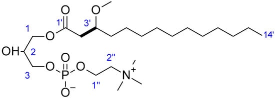 1-O-(3-methoxy-tetradecanoyl)-sn-glycero-3-phosphocholine (4): amorphous powder; 1H and 13C NMR, see Table 4; ESI-MS m/z 498.3 [M + H]+ (40), 258.1 (4), 184.1 (100), 125.0 (4), 104.1 (13), 86.1 (5); HRMS m/z 498.3188 [M + H]+ (calcd for C23H49NO8P+ 498.3190).