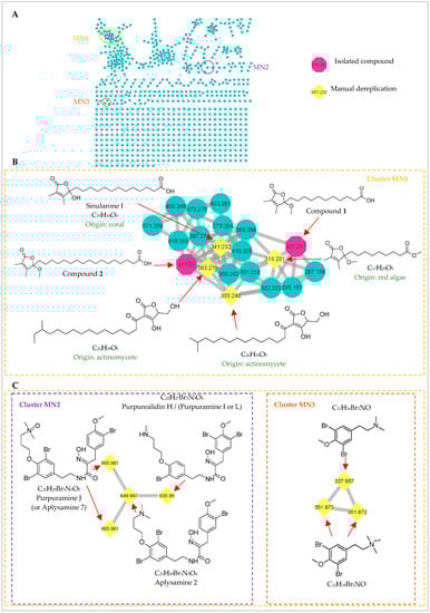 (A) Molecular Network constructed using MS/MS data from fractions of Scopalina hapalia, obtained after the removal of non-polar lipids of organic crude extract, with a cosine similarity cutoff of 0.7. Edge thickness corresponds to relative cosine score similarity between nodes. Annotated clusters are enlarged. (B) Cluster MN1 based on compounds 1 and 2 (octagonal nodes) related to butenolide derivatives. (C) Cluster MN2 and MN3 related to bromotyrosine metabolites.