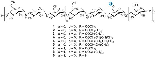 - Si, D.Y.; Zhong, D.F.; Xu, Q.M. Two butylated aminooligosaccharides isolated from the culture filtrate of Streptomyces luteogriseus. Carbohydr. Res. 2001, 335, 127–132. [Google Scholar] [CrossRef]