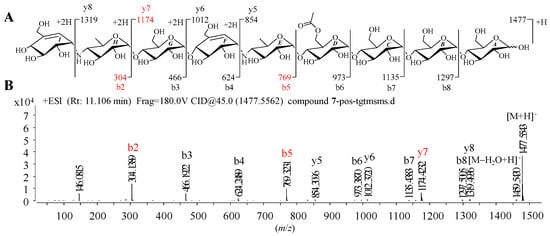 - Domon, B.; Costello, C.E. A systematic nomenclature for carbohydrate fragmentations in FAB-MS/MS spectra of glycoconjugates. Glycoconj. J. 1988, 5, 397–409. [Google Scholar] [CrossRef]
