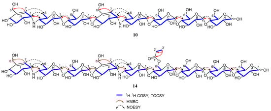 The molecular formula of 14 was assigned as C59H98N2O41 by HRESIMS ion peak at m/z 1491.5715 ([M + H]+, calcd for 1491.5718), which was 162 mass units more than that of 11. Detailed inspection of the NMR spectroscopic data of 11 and 14 suggested that they should feature an analogous planar structure (Figure 4), with the major difference being the presence of an additional glucose unit at the reducing end in 14 (δC 102.3, 79.9, 76.1, 74.3, 74.1 and 63.5). After a careful comparison of 1H and 13C NMR data of 15 and 16 (Table S2) with those of 14, three compounds were found to share the identical acarviostatin II03-type core skeleton, but the side chain differentiated. The propionyl functionality in 14 was replaced by the butyryl group in 15 (δH 2.45, 1.65, 1.18 and 0.94) or the 2-methyl-butyryl group in 16 (δH 2.52, 1.63, 1.51, 1.13 and 0.88), which could be supported by the 1H-1H COSY cross-peaks (H-2′/H-3′/H-4′ in 15, and H-5′/H-2′/H-3′/H-4′ in 16) and the HRMS/MS spectra (Figure 5 and Figure S2).