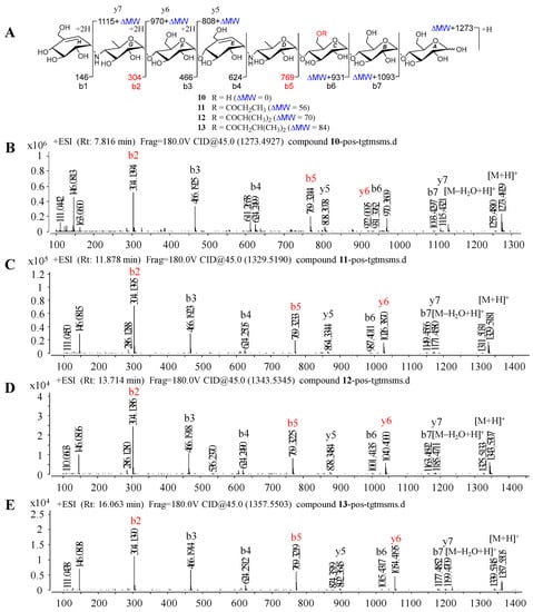 Positive HRESIMS/MS fragmentation and spectra of 10–13. (A) Positive-ion HRESIMS/MS fragmentation patterns of 10–13; (B–E) HRESIMS/MS spectra of 10–13.
