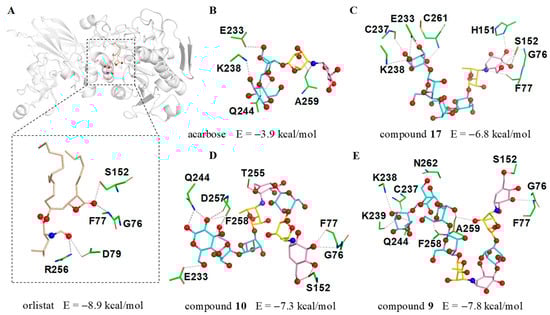 The significant PL inhibitory activity for aminooligosaccharides prompted us to further investigate the potential molecular recognition mechanism between this class of compounds and PL, thus the molecular docking simulations were implemented using a previously reported crystal structure of human PL (PDB ID: 1LPB) [,]. To better understand the binding mode of different aminooligosaccharides, the anti-obesity drug orlistat was firstly docked into the same domain for comparative purposes. As shown in Figure 7A, orlistat abrogated the activity of human PL by occupying the substrate binding canyon of PL and stabilized itself via strong interactions with a series of key residues (G76, F77, D79, S152 and R256) in the catalytic active site. Based on this, three characteristic aminooligosaccharides 9 (IC50 = 7.64 μM), 10 (IC50 = 12.66 μM), 17 (IC50 = 31.56 μM) as well as acarbose (negative control) belonging to acarviostatins II03, II02, I03 and I01 type, respectively, were selected as ligands for further detailed study.