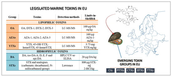 Regulated marine toxins in EU and their maximum levels in shellfish for human consumption: Azaspiracids (AZA), okadaic acid (OA), yessotoxins (YTXs), domoic acid (DA), and saxitoxins (STX). Main emerging marine toxins in EU: cyclic imines (CIs), palitoxins (PlTXs), ciguatoxins (CTXs), brevetoxins (BTXs), and tetrodotoxins (TTXs) [8,9]. Pectenotoxins are not included according to EFSA opinion and novel legislation [10,11,12].
