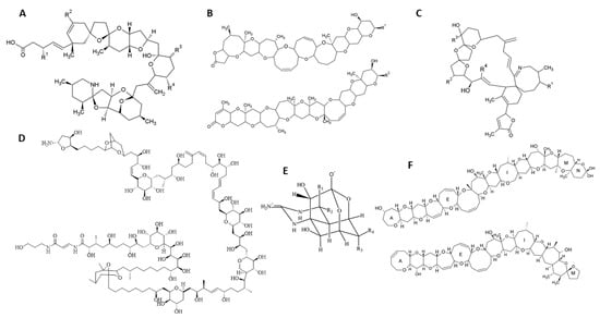 Emerging toxins general structure: (A) Azaspiracids, (B) Brevetoxins; (C) Spirolides; (D) Palytoxin; (E) Tetrodotoxin; (F) Ciguatoxins.