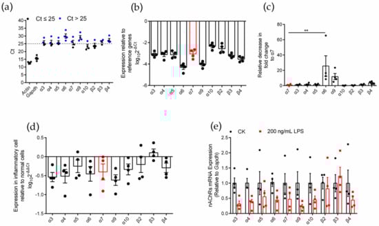 qPCR for various nAChR subunits gene expression analysis on LPS induced inflammatory RAW264.7 macrophages. (a): The Ct value of mRNA measured in four replicate normal cell groups. Each data point represents the average of three technical replicates of each gene from a single group. Blue circles in panel (a) indicate Ct values > 25 whereas black circles indicate values ≤ 25. (b): The expression levels of nAChR subunit mRNAs relative to those of the reference genes Gapdh. (c): The decrease in fold change of other nAChR subunits relative to α7 subunits. (d): Expression of each nAChR subunit gene in inflammatory cells relative to normal cells. Positive values indicate higher levels of expression in the inflammatory cell and negative values indicate higher levels in the normal cell for each gene. (e): A pairwise comparison for each nAChR subunit gene of the relative expression levels present in normal and inflammatory cells. ns, not significant or p > 0.05; ** p ≤ 0.01; the error bars in all figures indicate SEM; the values and statistical comparisons are shown in Table 1.