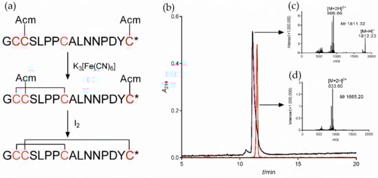 Oxidative folding, HPLC, and ESI-MS of α-CTx [A10L]PnIA. (a): Oxidative folding process of the linear crude [A10L]PnIA. The first step is oxidative folding in K3[Fe(CN)6] buffer, and the second step is oxidative folding in I2 solution under the protection of nitrogen. * amidated COOH terminal. (b): The HPLC profile of linear and Acm-protected (black) and oxidized (red) [A10L]PnIA. The linear and oxidized [A10L]PnIA were analyzed by reversed-phase analytical HPLC on a Vydac C18 column using a linear gradient of 10% to 55% Buffer B (0.1% TFA and 99.9% acetonitrile) over 30 min. Absorbance was monitored at 214 nm. (c): ESI-MS data of linear and Acm-protected [A10L]PnIA, with a monoisotopic mass of 1811.32 Da. (d): ESI-MS data of [A10L]PnIA, with a monoisotopic mass of 1665.20 Da.