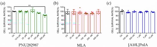 The α7 nAChR agonist PNU282987 and antagonists MLA and PnIA[A10L] used in this study were tested for the cytotoxicity in RAW264.7 macrophages (Figure 4). PNU282987 at five selected concentrations (12.5 μM, 25 μM, 50 μM, 100 μM, and 200 μM); MLA at five selected concentrations (25 nM, 50 nM, 100 nM, 200 nM, and 400 nM); PnIA[A10L] at five selected concentrations (100 nM, 500 nM, 1 μM, 5 μM, and 10 μM) were tested, and the results are shown in Figure 4a, Figure 4b, and Figure 4c, respectively. The results were analyzed with the one-way ANOVA and Dunn’s multiple comparison method. PNU282987 induced almost no toxicity when the concentration was below 100 μM. When the concentration increased to 200 μM, the cell viability decreased slightly compared with that of the control group, and the cell survival rate was approximately 85%. MLA showed almost no toxicity when the concentration was below 400 nM, and the cell survival rate was greater than 98%. Similarly, the optimal dose of PnIA[A10L] was 10 μM, within this concentration range, the cell viability is greater than 98%. Finally, the safe and reasonable concentrations of PNU282987, MLA, and PnIA[A10L] were identified in our experiment with 100 μM, 400 nM, and 10 μM, respectively.
