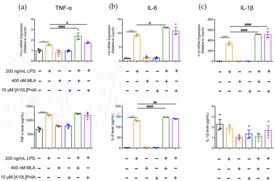 Effects of antagonists MLA and [A10L]PnIA on the promotion of proinflammatory cytokine expression in inflammatory RAW264.7 cells. After the cells were treated with MLA (400 nM) and [A10L]PnIA (10 μM) for 6–8 h, with or without LPS (200 ng/mL) over a further 12–16 h. (a–c): The effects of MLA and [A10L]PnIA on mRNA gene and protein expression level of proinflammatory cytokine TNF-α, IL-6, and IL-1β of inflammatory RAW264.7, respectively. qPCR was used to determine the mRNA gene expression of Tnf-α, Il-6, and Il-1β in the cells, and the protein expression of TNF-α, IL-6, and IL-1β in the culture medium was detected with an ELISA kit. ns, not significant or p > 0.05; *, # p ≤ 0.05; ## p ≤ 0.01; ****, #### p ≤ 0.0001, compared to the control and LPS-treated groups respectively, by one-way ANOVA followed by the Dunnett’s multiple comparisons tests, the error bars in all figures indicate SEM (n = 3).