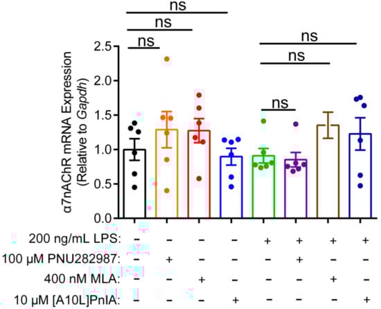 The effect of agonists and antagonists on α7 nAChR mRNA expression in RAW264.7 macrophages. After the cells were treated with α7 nAChR agonist [PNU282987 (100 μM)] and antagonists [MLA (400 nM) and [A10L]PnIA] for 6–8 h, with or without LPS (200 ng/mL) over further 12–16 h. The effects of LPS (200 ng/mL), PNU282987 (100 μM), MLA(400 nM), [A10L]PnIA (10 μM) on α7 nAChR mRNA expression were identified by using qPCR, ns, not significant or p > 0.05, compared to the control and LPS-treated groups respectively, by one-way ANOVA followed by the Dunnett’s multiple comparisons test. All data represent mean ± SEM (n = 6).