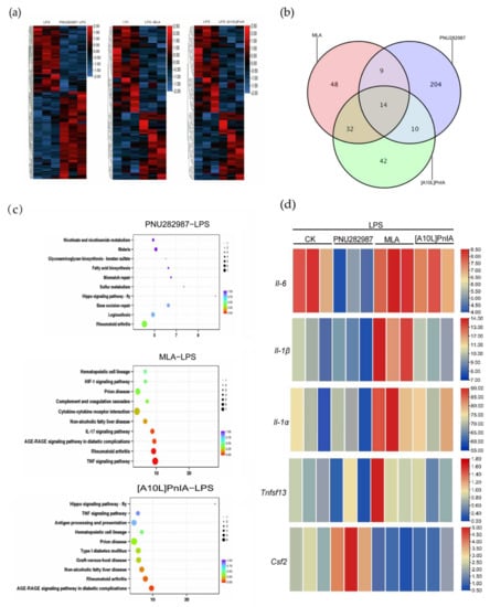 α7 nAChR agonist PNU282987 and antagonists MLA and [A10L]PnIA regulate inflammatory RAW264.7 cell gene expression by RNA sequencing. Differential gene analysis was performed between PNU282987 (100 μM) − LPS (200 ng/mL), MLA (400 nM) − LPS (200 ng/mL), [A10L]PnIA (10 μM) − LPS (200 ng/mL) and LPS (200 ng/mL) groups, respectively. (a): The heat map of genes with adjusted p-value < 0.05, Analysis by DESeq R package. (b): Venn diagram showing the overlap between PNU282987-induced inflammation RAW264.7 cells differential genes and MLA and [A10L]PnIA-induced inflammation RAW264.7 cells differential genes. (c): KEGG pathway analysis was performed between PNU282987 (100 μM) − LPS (200 ng/mL), MLA (400 nM) − LPS (200 ng/mL), [A10L]PnIA (10 μM) − LPS (200 ng/mL) and LPS (200 ng/mL) groups, respectively, Analysis by topGO R package, The abscissa is Enrichment Factor; q-value is p-value after correction of multiple hypothesis testing; the size of the circle is the count of genes enriched in the pathway. (d): Heat map analysis of five key genes.