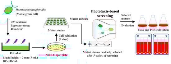 In order to improve astaxanthin productivity from H. pluvialis, various approaches have been used such as development of strains, optimization of culture conditions, protoplast fusion with other microalgae, and addition of nanoparticles [20,21,22,23]. Among these approaches, the development and selection of strains is the most important strategy in industrial production [24]. Random mutagenesis by ultraviolet (UV) irradiation is a common and cost-effective technique for strain development [25]. Various studies have been conducted to develop genetically modified mutants with high growth rate and astaxanthin productivity through random mutagenesis [26,27,28]. However, one of the disadvantages of random mutagenesis is that it is difficult to select strains with improved specific efficacy among numerous variants, and the selection process requires a lot of time and labor. Microfluidic-based technologies with specific light can rapidly screen strains at the single-cell level, taking into account the size, shape, and characteristics of microalgae [29]. In a previous study [30], strains with improved photosynthetic productivity were selected using a microfluidic device fabricated by applying the phototaxis technique.