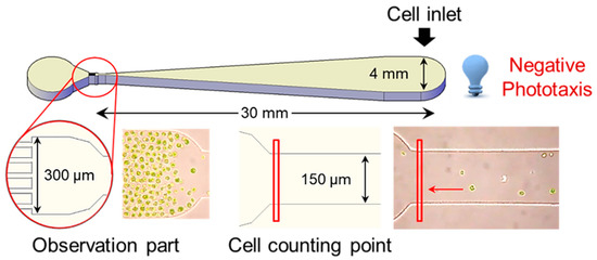 A PDMS-based microfluidic device was fabricated using standard soft photolithography [52]. The design of the microstructure was generated using AutoCAD software and printed on transparent photomask film. A silicon mold master was fabricated by using SU-8 negative photoresist (SU-8 50, Microchem, Newton, MA, USA) on silicon wafers. The PDMS pre-polymer (10:1 mixture of 184 Sylgard base and curing agent, Dow Corning) was poured on the SU-8 mold and cured thermally at 80 °C. The PDMS layer containing the microchannel was bonded to a glass slide using oxygen plasma. The microfluidic device was composed of an inlet chamber (4 mm in diameter), outlet chamber (4 mm in diameter), and microchannel (30 mm in length, 50 μm in height) including observation zone (channel length 300 μm, width 100 μm, height 50 μm) near the outlet chamber. The width of the microchannel gradually decreased from 4 mm (at the inlet) to 150 μm (at the observation zone) to reduce hindrance of the phototactic movement by microchannel and facilitate the monitoring of the phototactic response at the single-cell resolution level (Figure 2).