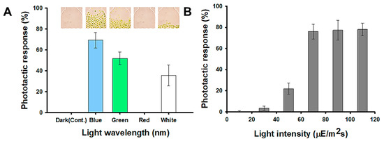 Figure 3A represents the negative phototaxis of the H. pluvialis to five different light wavelengths and H. pluvialis shows the most sensitive response to the blue light wavelength (470 nm). About 69.33% of the cells injected moved to the opposite chamber (observation part) for 30 min by the blue light. In the green light (540 nm), the phototactic response was reduced by 25% compared to the result in the blue light. In the red light (700 nm), there was no reaction to the light during 30 min as in the dark condition (control). These results show a trend similar to that of the model microalgae, Chlamydomonas reinhardtii, which has been reported to exhibit phototaxis by detecting the direction, intensity, and wavelength of light because it has an eyespot in the thylakoid membrane [30,34]. Tamaki et al. [35] reported that carotenoids, such as astaxanthin, fucoxanthin, and diadinoxanthin are major constituents of eyespot and are essential for the phototactic response. In addition, it has been reported that blue light significantly improves astaxanthin productivity of H. pluvialis [36]. Therefore, it can be inferred that H. pluvialis, which has sensitive phototaxis properties, contains a large amount of astaxanthin. Figure 3B is a result showing the light responses to different light intensities, and shows that the negative phototaxis of the H. pluvialis increased up to the 70 µmol photons m−2 s−1. However, there was little change at the intensity above 70 µmol photons m−2 s−1. Therefore, 70 µmol photons m−2 s−1 was set as the standard for measuring the phototactic behavior in this study.