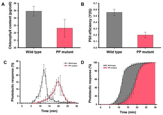 Optical characteristics of the wild type (grey) and PP mutant (red): (A) Chlorophyll content, and (B) Y(II) of the wild type and PP mutant. (C) The phototactic response, and (D) Cumulative histogram of phototactic response of the wild type and PP mutant for 30 min. The phototactic response was measured on 3000 cells per analysis. All data are the mean of three biological replicates.