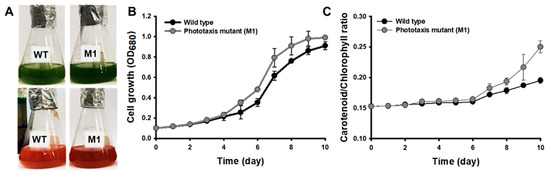 Flask cultivation of the wild type and M1 mutant screened by phototaxis: (A) Photo image of the wild type and M1 mutant under growth (up) and induction stage (down). (B) Absorbance in growth stage, and (C) Carotenoid/Chlorophyll ratio of in induction stage. The cells were grown in NIES-C medium and CO2 concentration and light intensity were fixed at 5% and 40 µmol photons m−2 s−1, respectively. Error bars indicate the standard deviations of the means for three experiments.
