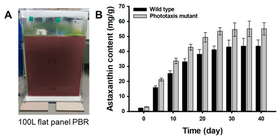 In order to confirm the improved astaxanthin productivity of the M1 mutant, the flat panel photo-bioreactor of 100 L scale was manufactured using acrylic. The M1 mutant and wild-type strain pre-cultured in a 1 L flask for 10 days were inoculated and grown for 30 days (Figure 6A). In the growth phase, the M1 mutant showed a faster growth rate and 1.1-fold higher biomass production than the wild-type strain, which was similar to the results of the flask experiment (data not shown). This is because the M1 mutant has a higher photosynthetic efficiency than the wild type for the same light intensity condition (40 µmol photons m−2 s−1). After the vegetative growth phase, cells were exposed to a continuous strong light at 200 μmol photons m−2 s−1 along with N-deprivation for the next 40 days in the red stage. The astaxanthin contents formed in the M1 mutant cells through an induction period of 40 days was 55.12 ± 4.12 mg g−1, which was 1.26-fold higher than that of the wild-type strain (43.62 ± 3.98 mg g−1) (Figure 6B). These results show that the M1 mutant has a 32% higher light reactivity and 18.5% faster light response rate than the wild-type strain, so it could rapidly sense the light faster than the wild-type strain against strong light irradiation during the induction period. Therefore, it is inferred that the M1 mutant promoted the synthesis of the astaxanthin to prevent oxidation of cells faster than the wild-type strain.