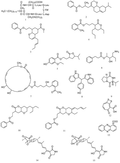 A cyclic lipopeptide N3 produced by B. amyloliquefaciens M1 was identified as surfactin (1, Figure 1). The minimal inhibitory concentration (MIC) of the purified lipopeptide N3 against V. anguillarum was 1.5 μg/mL (Table 1) [13]. 3-(octahydro-9-isopropyl-2H-benzo[h]chromen-4-yl)-2-methylpropyl benzoate (2) and methyl 8-(2-(benzoyloxy)-ethyl)-hexahydro-4-((E)-pent-2-enyl)-2H-chromene-6-carboxylate (3) are two polyketides with activity against Vibrio vulnificus and were isolated from the ethyl acetate extract of B. amyloliquefaciens associated with edible red seaweed, Laurenciae papillosa. The compounds 2 and 3 demonstrated significant antibacterial activity against V. vulnificus (inhibitory zone diameter of 18.00 ± 1.00 mm and 16.67 ± 0.58 mm, 25 mcg on disk) [14]. Three polyketides from Bacillus amyloliquefaciens associated with seaweed Padina gymnospora were characterized as 11-(15-butyl-13-ethyl-tetrahydro-12-oxo-2H-pyran-13-yl) propyl-2-methylbenzoate (4), 9-(tetrahydro-12-isopropyl-11-oxofuran-10-yl)-ethyl-4-ethoxy-2-hydroxybenzoate (5), and 12-(aminomethyl)-11-hydroxyhexanyl-10-phenylpropanoate (6). Compounds 4–6 displayed significant antibacterial activities against V. vulnificus MTCC 1145, A. hydrophila MTCC 646, and V. vulnificus MTCC 1145 with inhibitory zone diameters of 16.33 ± 0.58 mm, 14.67 ± 1.15 mm, and 17.33 ± 1.00 mm (10 mcg on disk), respectively [15].
