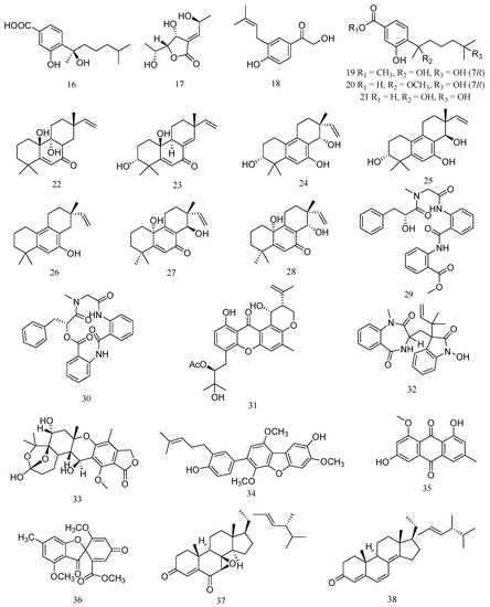 Structures of marine Aspergillus-derived compounds against aquatic pathogenic bacteria, (−)-sydonic acid (16), asperochrin A (17), terreprenphenol A (18), ent-aspergoterpenin C (19), 7-O-methylhydroxysydonic acid (20), hydroxysydonic acid (21), aspewentin D (22), aspewentin F (23), aspewentin G (24), aspewentin H (25), aspewentin A (26), aspewentin I (27), aspewentin J (28), seco-clavatustide B (29), clavatustide B (30), aspergixanthone I (31), 3-((1-hydroxy-3-(2-methylbut-3-en-2-yl)-2-oxoindolin-3-yl)methyl)-1-methyl-3,4-dihydrobenzo[e][1,4]diazepine-2,5-dione (32), austalide R (33), 4-methyl-3”-prenylcandidusin A (34), questin (35), trypacidin (36), 7β,8β-epoxy-(22E,24R)-24-methylcholesta-4,22-diene-3,6-dione (37), and ergosta-4, 6, 8(14), 22-tetraene-3-one (38).