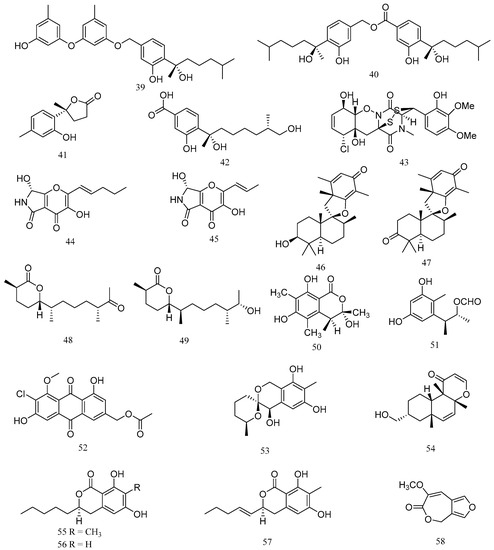 Three new dihydroisocoumarin derivatives, penicisimpins A–C (55–57), were isolated from Penicillium simplicissimum MA-332, a fungus that was isolated from the rhizosphere of the marine mangrove plant Bruguiera sexangula var. rhynchopetala. Compounds 55–57 exhibited broad-spectrum inhibitory activities with various MIC values ranging from 4 to >64 mg/mL, with compound 55 showing highest activities against P. aeruginosa, V. parahaemolyticus, and V. harveyi, with MIC value of 4 μg/mL, while compounds 56 and 57 exhibited moderate activities against the tested strains [43]. One novel 7-membered lactone derivative, penicillilactone A (58), was isolated from the sponge-derived fungus Penicillium sp. LS54. Compound 58 showed antibacterial activity against V. harveyi, with a MIC value of 8 μg/mL [44].
