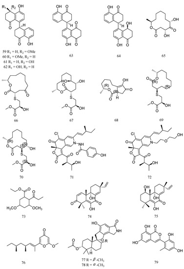 Structures of anti-aquatic pathogenic bacterial compounds isolated from marine fungi belonging to genera other than Aspergillus and Penicillium, cladosporol F (59), cladosporol G (60), cladosporol H (61), cladosporol I (62), cladosporol C (63), cladosporol J (64), pandangolide 1 (65), thiocladospolide A (66), thiocladospolide D (67), cladocladosin A (68), thiocladospolide F (69), thiocladospolide G (70), chaetoviridide A (71), chaetoviridide B (72), ethyl 3,5-dimethoxy-2-propionylphenylacetate (73), libertellenone M (74), libertellenone A (75), fusolanone B (76), stachybomycin E (77), stachybotrylactam acetate (78), and trichophenol A (79).