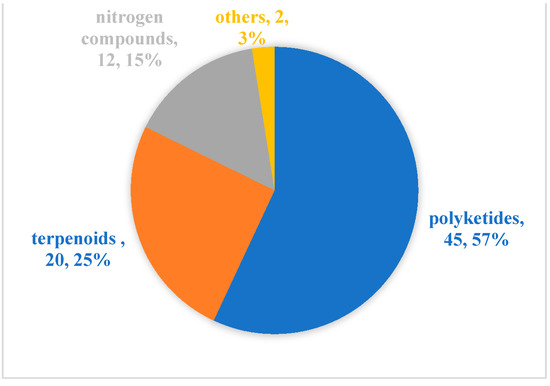 Since Cephalosporins were isolated from the secondary metabolites of marine-derived fungus Acremonium chrysogenum in 1945, especially since the 1990s, more than 20,000 inspirational natural products with diverse structures and potential bioactivities have been discovered in marine microbes [55]. From our literature review, although marine microbial secondary metabolites have been shown to have diverse biological activities [11,56], there are relatively few reports evaluating their antibacterial activity against aquatic pathogens [13,14,15,16,17,18,19,20,21,22,23,24,25,26,27,28,29,30,31,32,33,34,35,36,37,38,39,40,41,42,43,44,45,46,47,48,49,50,51,52,53,54]. Among the 79 active molecules against aquatic bacterial pathogens, there are only 15 compounds derived from marine bacteria, accounting for 19%. In contrast, antibacterial compounds derived from marine fungi accounted for more than 80%, and were isolated mainly from two genera Aspergillus (23, 29%) and Penicillium (20, 25%) (Figure 5). When it comes to structural classes, polyketides, terpenoids and nitrogen-containing compounds are the three major structural types of marine microbial-derived anti-aquatic pathogenic bacterial active molecules, accounting for 57%, 25%, and 15%, respectively (Figure 6).