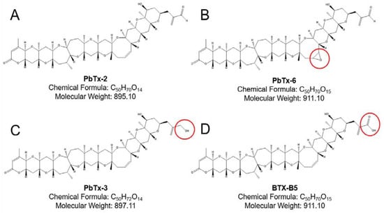 Type B brevetoxin structures. The parent type B brevetoxin PbTx-2, with the aldehyde end group, is shown in Panel A. Panel B shows PbTx-6 with the epoxide group on the H-ring of the polyether backbone. Panel C shows a main metabolite PbTx-3, in which the aldehyde of PbTx-2 has been reduced to an alcohol. Panel D shows another metabolite, BTX-B5, which differs from PbTx-2 and PbTx-3 by a carboxylic acid functional group. Red circles on Panels B–D illustrate the key structural differences from the parent PbTx-2.