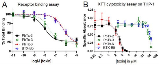 Comparison of VGSC binding vs. THP-1 cytotoxicity for the four brevetoxin B analogs. A receptor binding assay was used to measure binding of brevetoxins to the VGSC receptor (Panel A), whereas an XTT assay was used to measure cytotoxicity of the brevetoxins to THP-1 monocytes (Panel B). Black squares indicate PbTx-2, green circles indicate PbTx-3, red diamonds indicate PbTx-6, and blue triangles indicate BTX-B5. Data are shown as mean +/− standard deviation for each concentration (n = 3 for each assay).