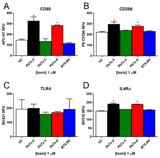 To investigate the potential cellular effects of brevetoxins, we treated THP-1 monocytes with the four analogs and examined the cell-surface expression of key inflammatory markers, as well as the inflammatory cytokine secretion. We chose a consistent dose of 1 µM, as that dose was nontoxic for all four analogs but also elicited some degree of VGSC binding. As shown in Figure 3, the aldehyde-containing brevetoxins (PbTx-2 and PbTx-6) elicited significant increases in THP-1 cell surface expression of Cluster of Differentiation (CD) 80 (Figure 3A). CD80 is an important molecule in coordinating inflammatory responses and activating T cells [,]. It is also a sign of M1 or the classical activation of monocytes, which typically results in a proinflammatory response. PbTx-2 yielded a 122% increase in CD80 expression over vehicle control, while PbTx-6 yielded a 93% increase in CD80 over vehicle control. To a significant yet lesser extent, aldehyde-containing brevetoxins (PbTx-2 and PbTx-6) also elicited increases in M2/alternative activation markers CD206 and Interleukin 4 receptor alpha (IL4Rα), but they did not cause changes in cell-surface expression of the lipopolysaccharide (LPS) receptor toll-like receptor (TLR) 4 (Figure 3B–D). CD206 is a mannose receptor that is important in phagocytic responses of monocytes, and IL4Ra is a receptor for the IL-4 cytokine signaling molecule that results in the alternative activation of monocytes, polarized to an M2-like or anti-inflammatory response. Both CD206 and IL4Ra are involved in resolution of inflammation [,]. Treatment with the other brevetoxin analogs (i.e., PbTx-3 and BTX-B5) that did not have aldehyde groups did not result in activation of any monocyte response elements measured (Figure 3). We also examined TNFα, IL-6, and IL-1β cytokine secretion following exposure to all four analogs, but none of the brevetoxins elicited measurable responses (data not shown).