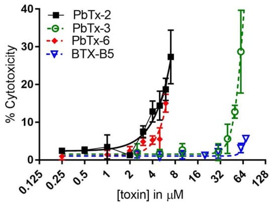The cytotoxicity we report herein is likely a combination of VGSC binding and an alternative mechanism that is mediated by the aldehyde functional group (e.g., Trx/TrxR inhibition), and in the case of BTX-B5, the carboxylic acid functional group. The patterns from flow cytometry experiments indicate that PbTx-3 exhibits a relatively simple cell death pattern (mainly necrosis) at high doses, which is likely due to VGSC activation. However, brevetoxins with other reactive groups, including aldehydes and even carboxylic acids, may mediate different mechanisms of cytotoxicity in monocytes, perhaps through enzymatic interactions. One study found that the induction of apoptosis in cancer cells by exogenous electrophiles was dependent on TrxR C-terminal modification []. If the aldehydes of PbTx-2 and PbTx-6 act as exogenous electrophiles as others have suggested [,], then that would explain how these cells are also able to induce apoptosis in monocytes. Studies are ongoing in our lab to discover the precise mechanisms of action of each toxin and the interactions of VGSC activation along with enzymatic interactions.