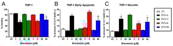 THP-1 monocytes undergo apoptosis and necrosis when exposed to brevetoxins. THP-1 cells were treated with PbTx-2, PbTx-3, PbTx-6, or BTX-B5 at approximate EC50 doses (2µM or 50 µM) or half EC50 doses (1 µM or 25 µM). Panel A shows the proportion of healthy cells. Panel B shows cells that were positive for annexin V but not 7-AAD (i.e., early apopototic), and Panel C shows cells that were positive for both Annexin V and 7-AAD (i.e., late apoptotic or necrotic). Data is presented as mean ± standard deviation, with * indicating a statistically significant difference from vehicle control (VC).