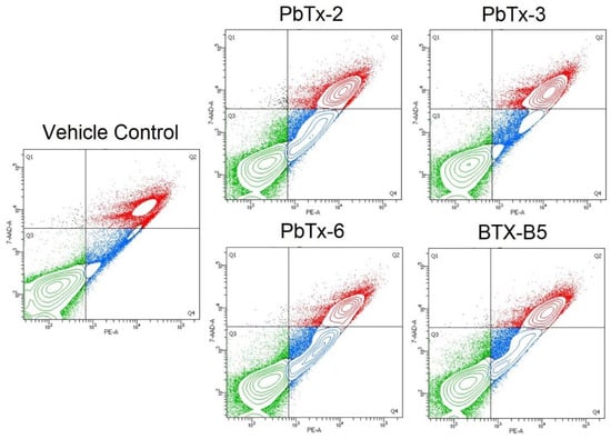 For the apoptosis assay, THP-1 cells (ATCC, Manassas, VA, USA) were plated 7 × 105 cells/mL in Greiner 12 well plates (Greiner Bio-One, Monroe, NC, USA) and incubated for 2 h. Cells were then treated with brevetoxins, PbTx-2 and PbTx-6 at 1 µM and 2 µM and PbTx-3 and BTX-B5 at 25 µM and 50 µM. Doses correlate to approximate EC50 values and half EC50 values for each cluster. The treated cells were then incubated for 24 h and harvested with cold PBS. Fc receptors were blocked for 15 min using goat serum (Gibco, Waltham, MA, USA). Cells were stained using BD Biosciences PE Annexin V Apoptosis Kit (Franklin Lakes, NJ, USA) to kit instructions. Primary gating was performed by positive PE or positive 7AAD, with secondary gating performed by setting up quadrant along positive stain lines when 7AAD was plotted against PE.