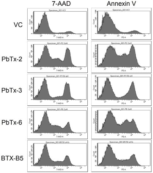Representative histograms of flow cytometry analysis for the various brevetoxins vs. vehicle control (VC). The left column shows 7-AAD staining, whereas the right shows annexin V.