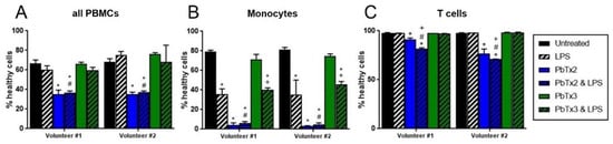 Viability of PBMCs when treated with brevetoxins and/or LPS. PBMCs were isolated from two individual volunteers and treated with either PbTx-2 or PbTx-3 (1 µM), with or without 100 ng/mL LPS. Panel A shows all PBMCs in aggregate, whereas Panel B is gated to the population of monocytes and Panel C is gated to the population of T cells, as previously determined by CD14+ and CD3+ targeting. Black indicates untreated cells, blue PbTx-2, and green PbTx-3, with added stripes for LPS co-treatment. Data is presented as mean ± standard deviation (n = 2), with * indicating statistically significant difference from untreated (black), # from LPS-alone (white/black stripes), and + from the corresponding toxin-only treatment (p < 0.05).
