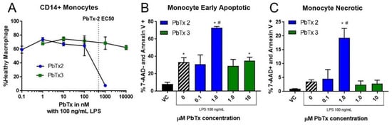 CD14+ monocytes undergo apoptosis and necrosis when exposed to PbTx-2. PBMCs were isolated and treated with either PbTx-2 (100 pM, 1 nM, 10 nM, 100 nM, 1 µM) or PbTx-3 (1 nM, 10 nM, 100 nM, 1 µM, and 10 µM) and 100 ng/mL of LPS. Panel A shows the proportion of healthy cells in dose response for both. Panel B shows cells that were positive for annexin V but not 7-AAD (i.e., early apopototic), and panel C shows cells that were positive for both annexin V and 7-AAD (i.e., necrotic). Data is presented as mean ± standard deviation, with * indicating statistically significant difference from vehicle control (VC), # from VC with LPS (p < 0.05).