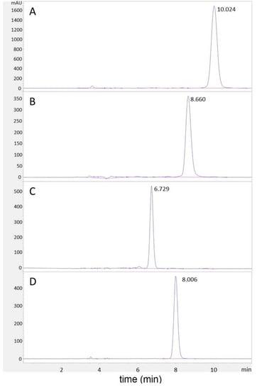 Purity tests of brevetoxins. HPLC-UV chromatograms for purity tests of (A) PbTx-2, (B) PbTx-3, (C) PbTx-6, and (D) BTX-B5 analyzed at 215 nm.